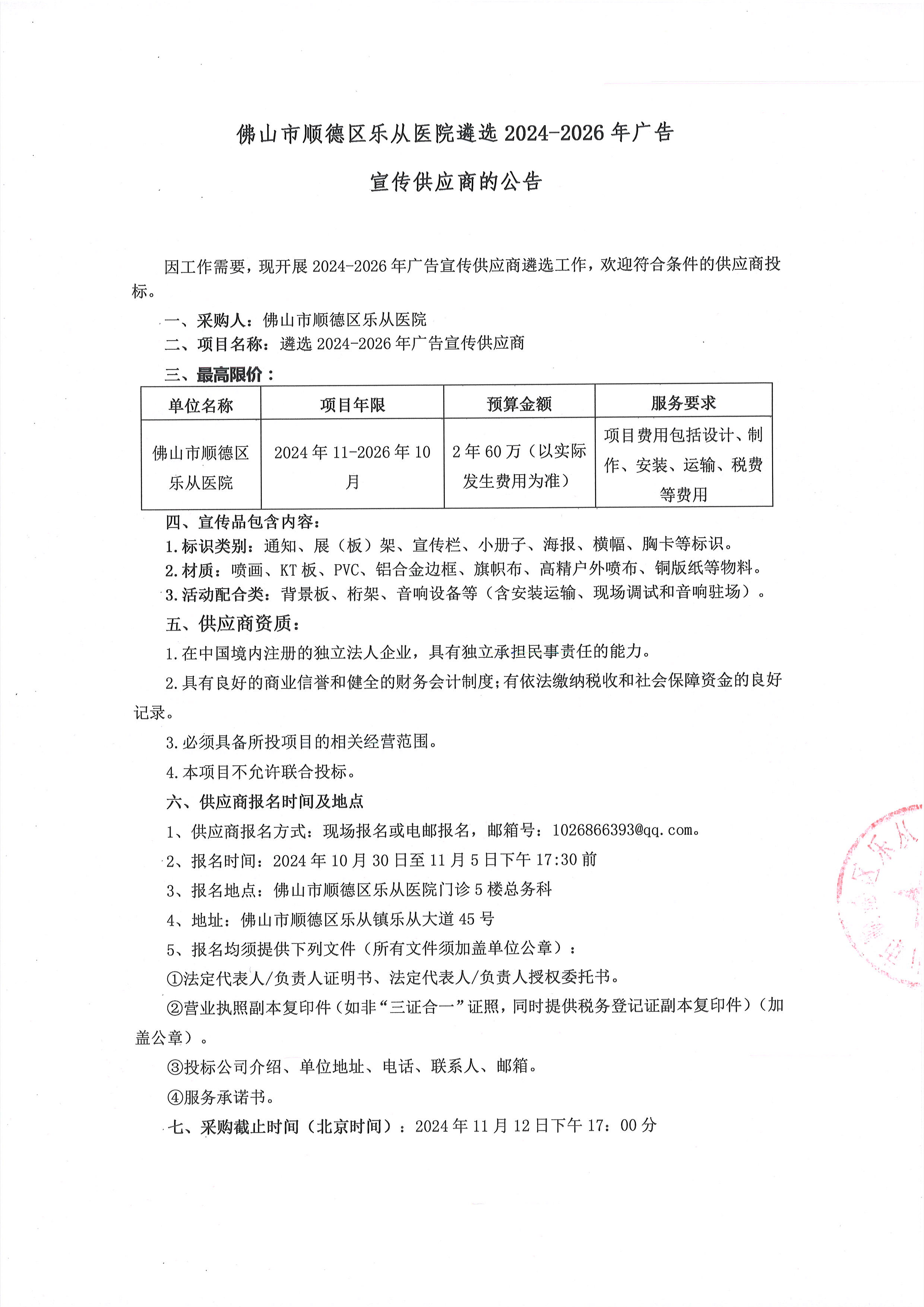 樂(lè)從醫(yī)院遴選2024-2026年廣告宣傳供應(yīng)商的公告
