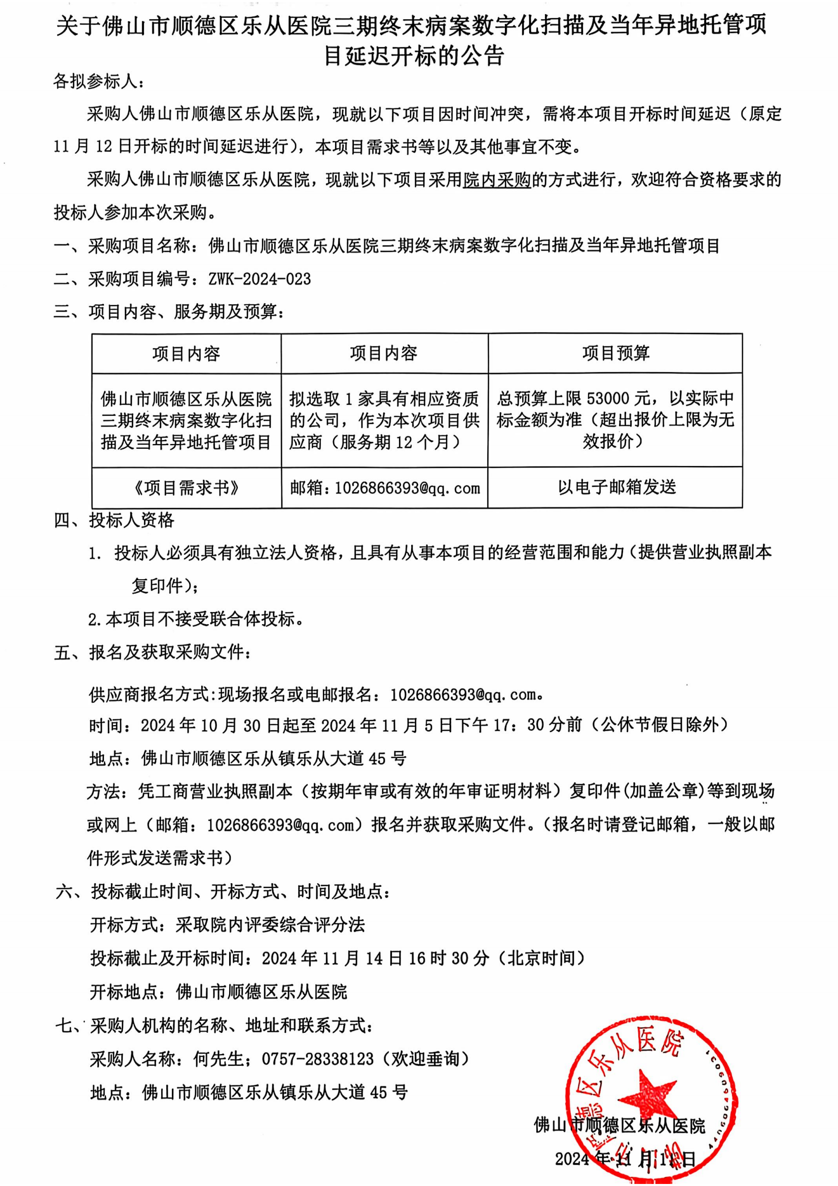 樂從醫(yī)院三期終末病案數(shù)字化掃描及當年異地托管項目延遲開標的公告
