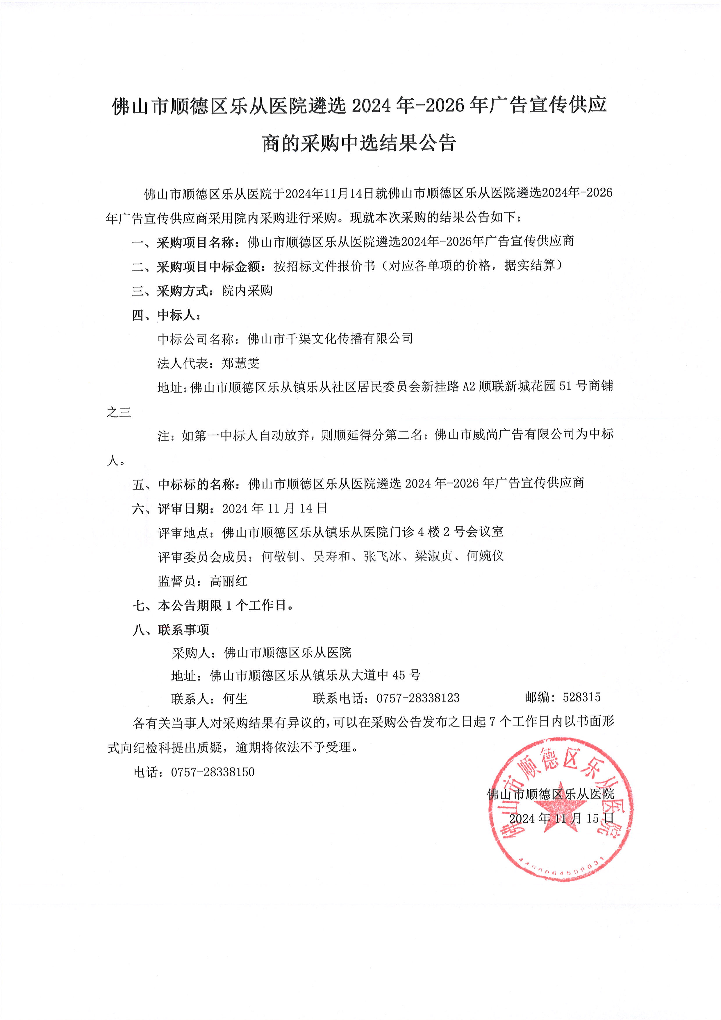樂(lè)從醫(yī)院遴選2024-2026年廣告宣傳供應(yīng)商的采購(gòu)中選結(jié)果公告