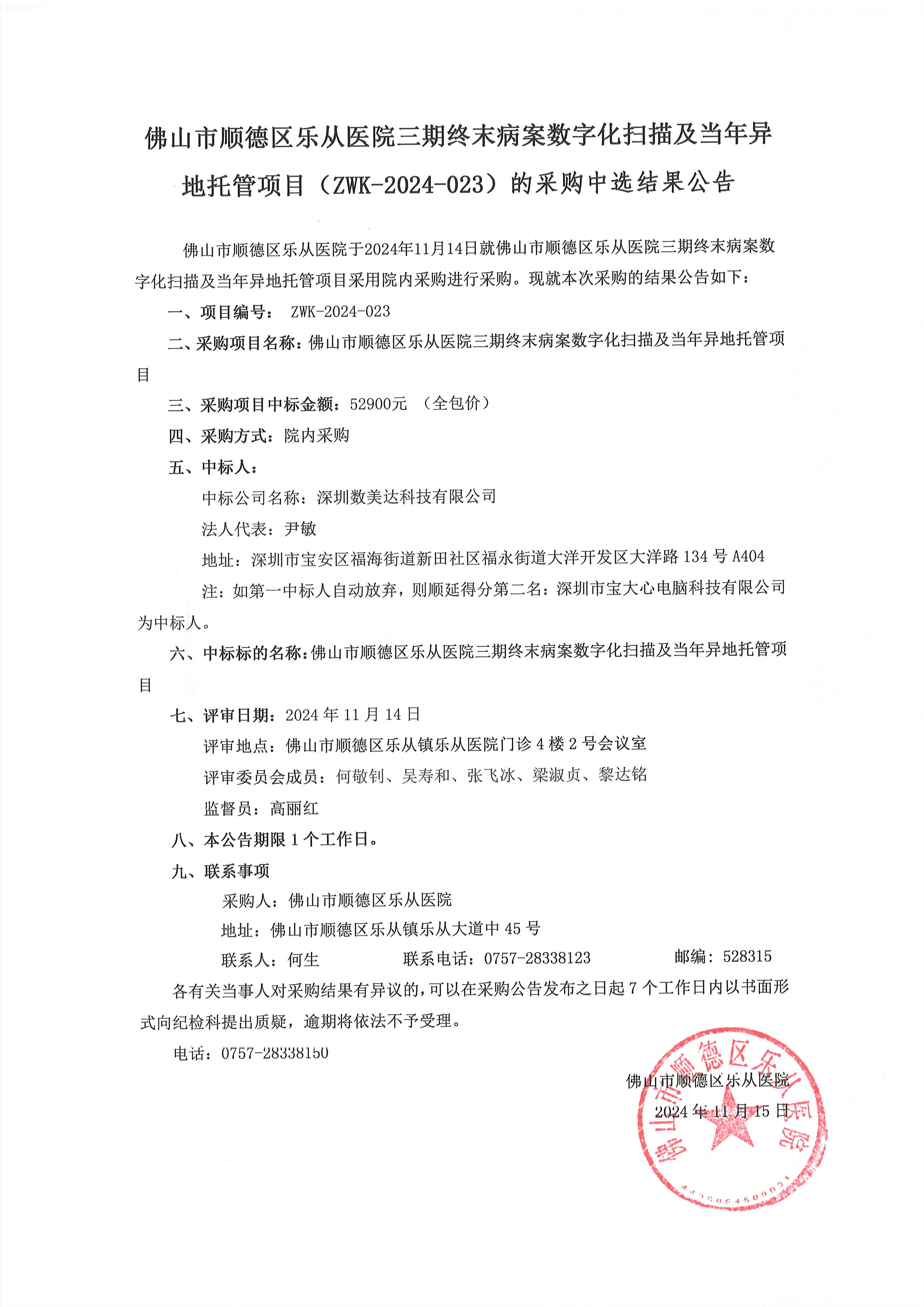 樂(lè)從醫(yī)院三期終末病案數(shù)字化掃描及當(dāng)年異地托管項(xiàng)目(ZWK-2024-023)的采購(gòu)中選結(jié)果公告