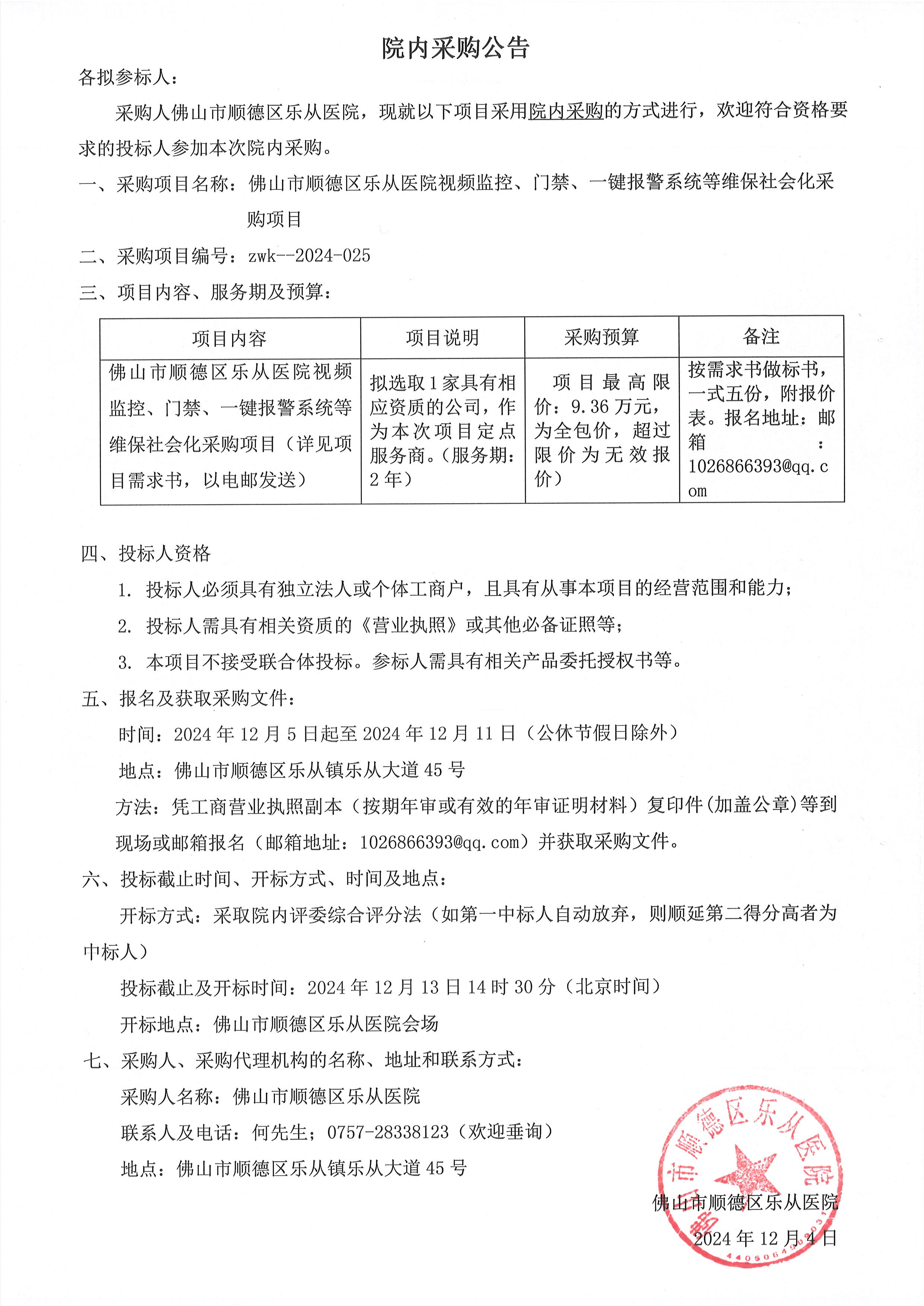 樂從醫(yī)院視頻監(jiān)控、門禁、一鍵報警系統(tǒng)等維保項目的院內(nèi)采購公告