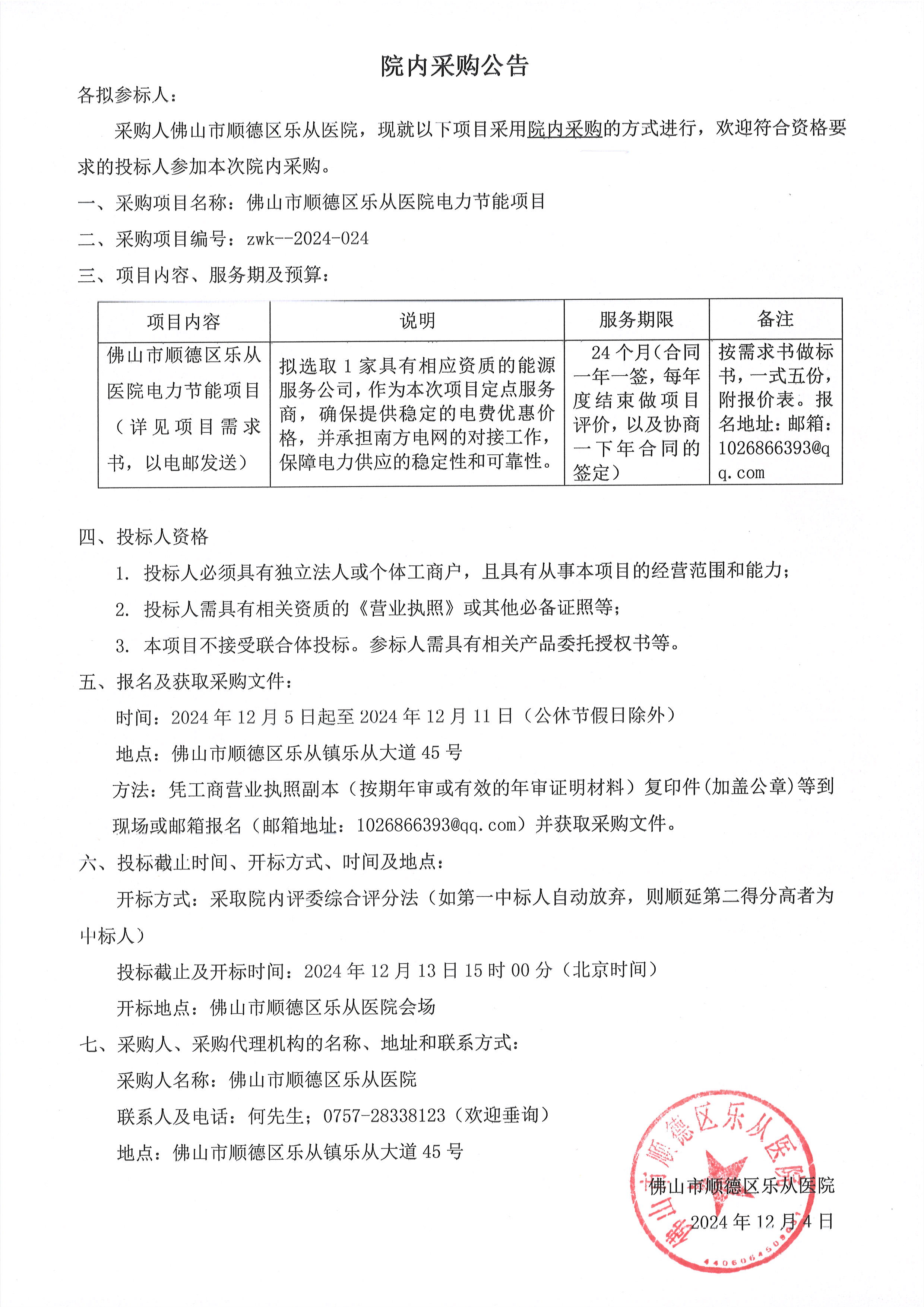 樂從醫(yī)院電力節(jié)能項目的院內(nèi)采購公告
