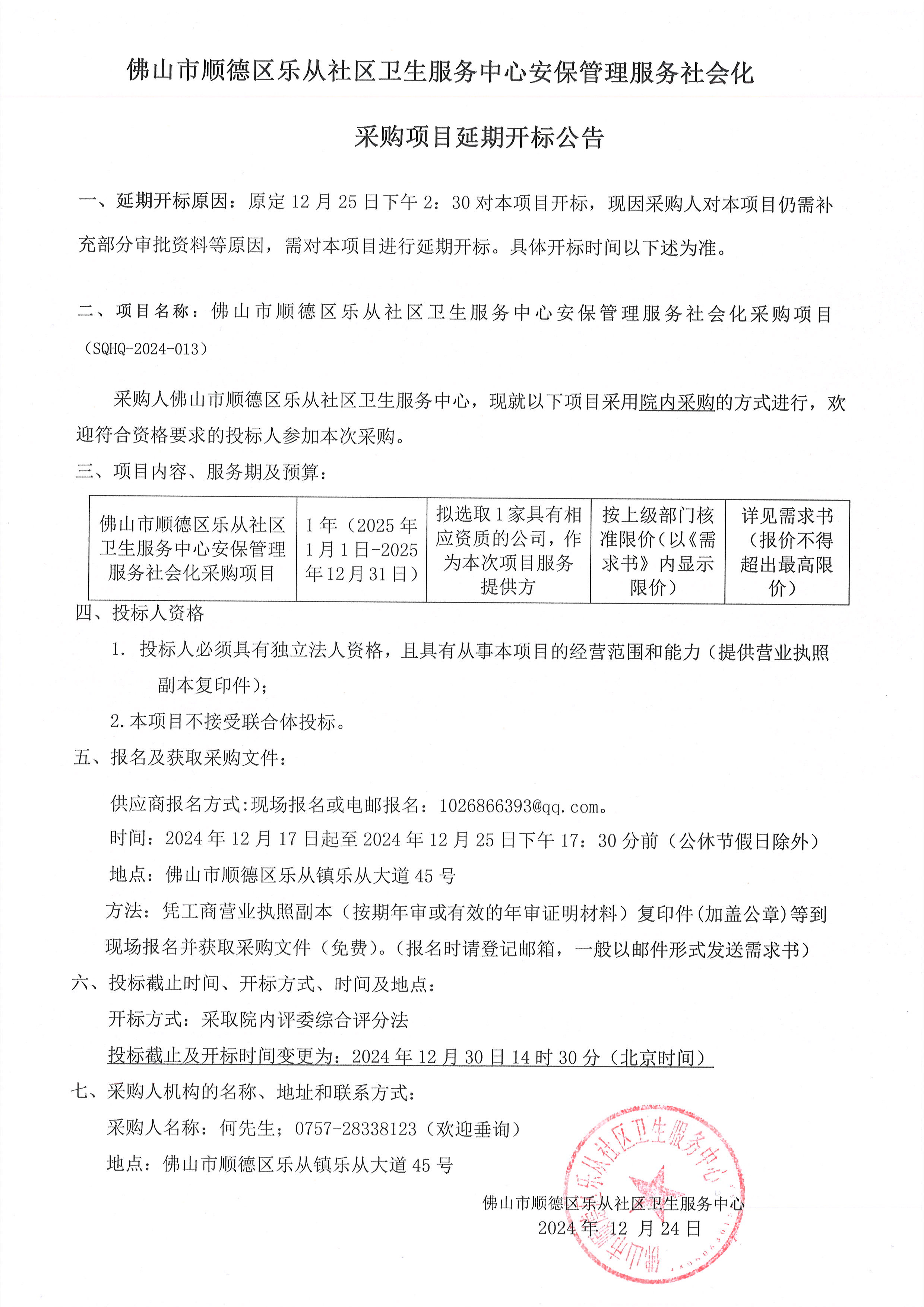 樂從社區(qū)衛(wèi)生服務中心安保管理服務社會化采購項目延期開標公告