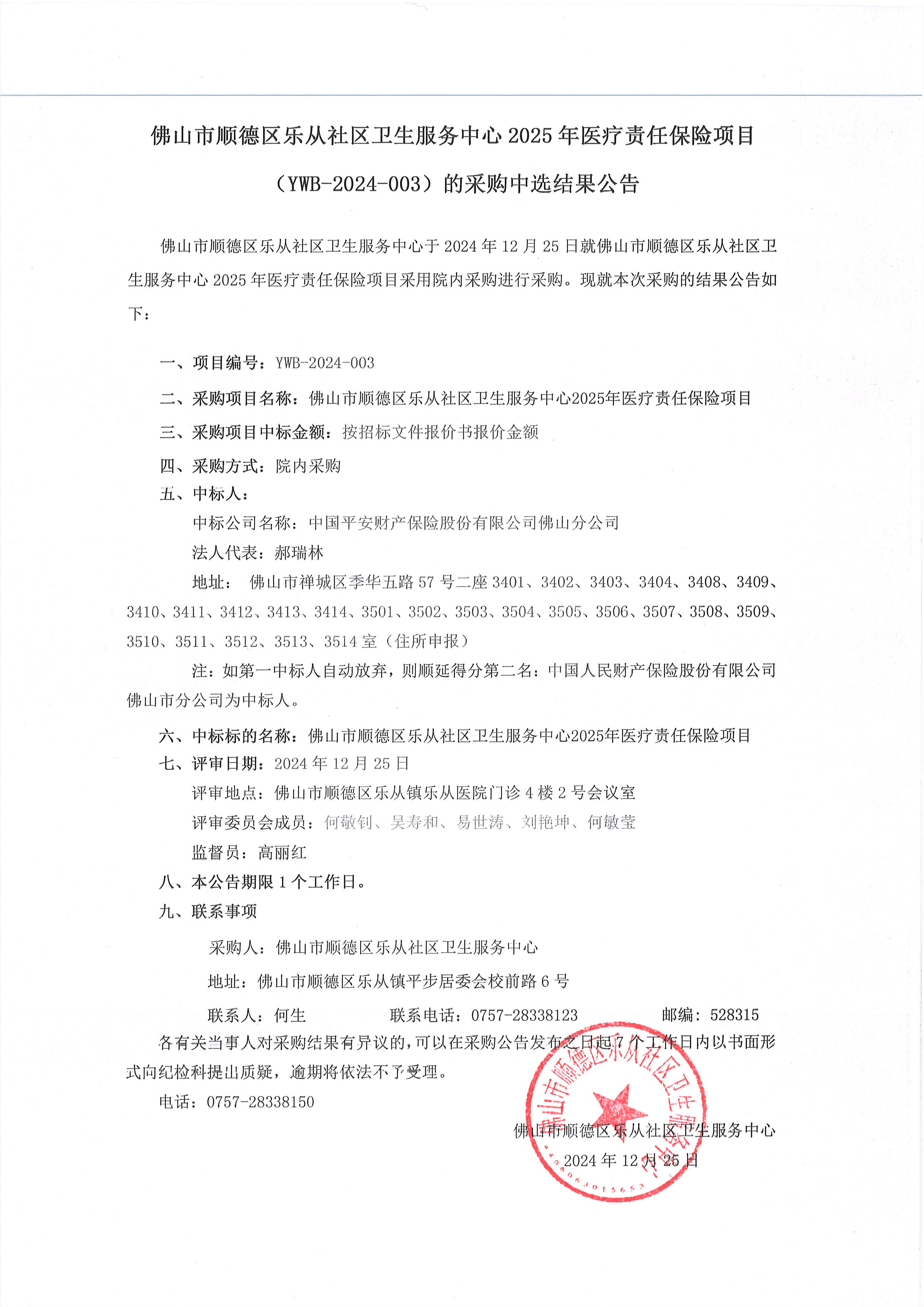佛山市順德區(qū)樂從社區(qū)衛(wèi)生服務(wù)中心2025年醫(yī)療責(zé)任保險(xiǎn)項(xiàng)目(YWB-2024-003)的采購(gòu)中選結(jié)果公告