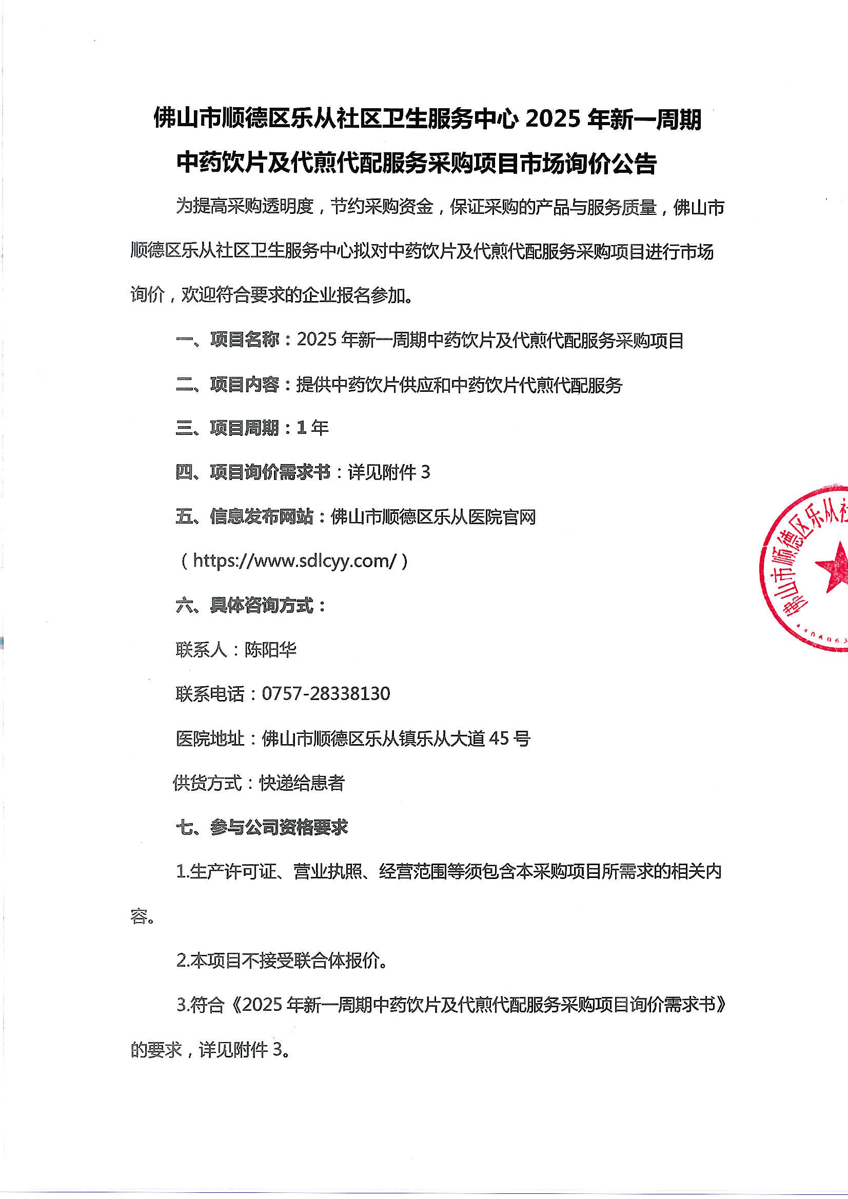 佛山市順德區(qū)樂從社區(qū)衛(wèi)生服務(wù)中心2025年新一周期中藥飲片及代煎代配服務(wù)采購項(xiàng)目市場(chǎng)詢價(jià)公告