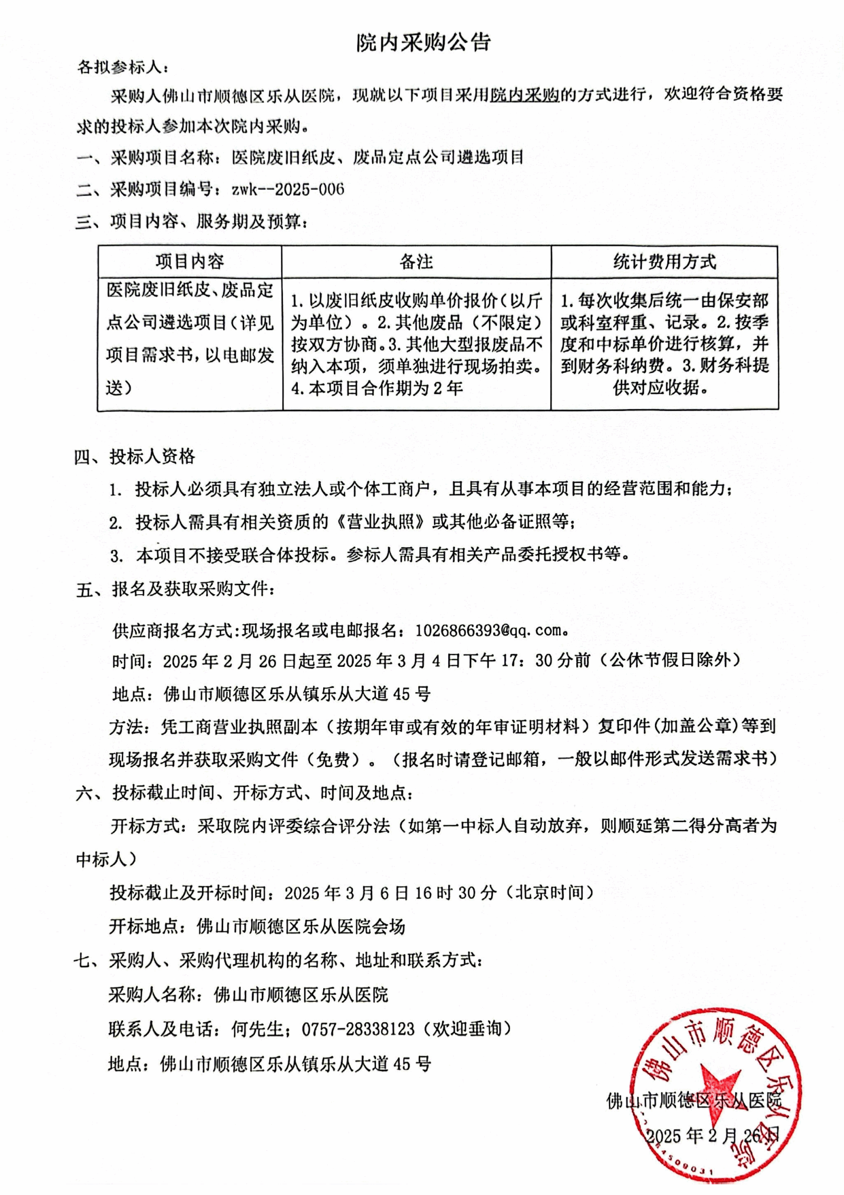 佛山市順德區(qū)樂從醫(yī)院廢舊紙皮、廢品定點公司遴選項目的院內(nèi)采購公告