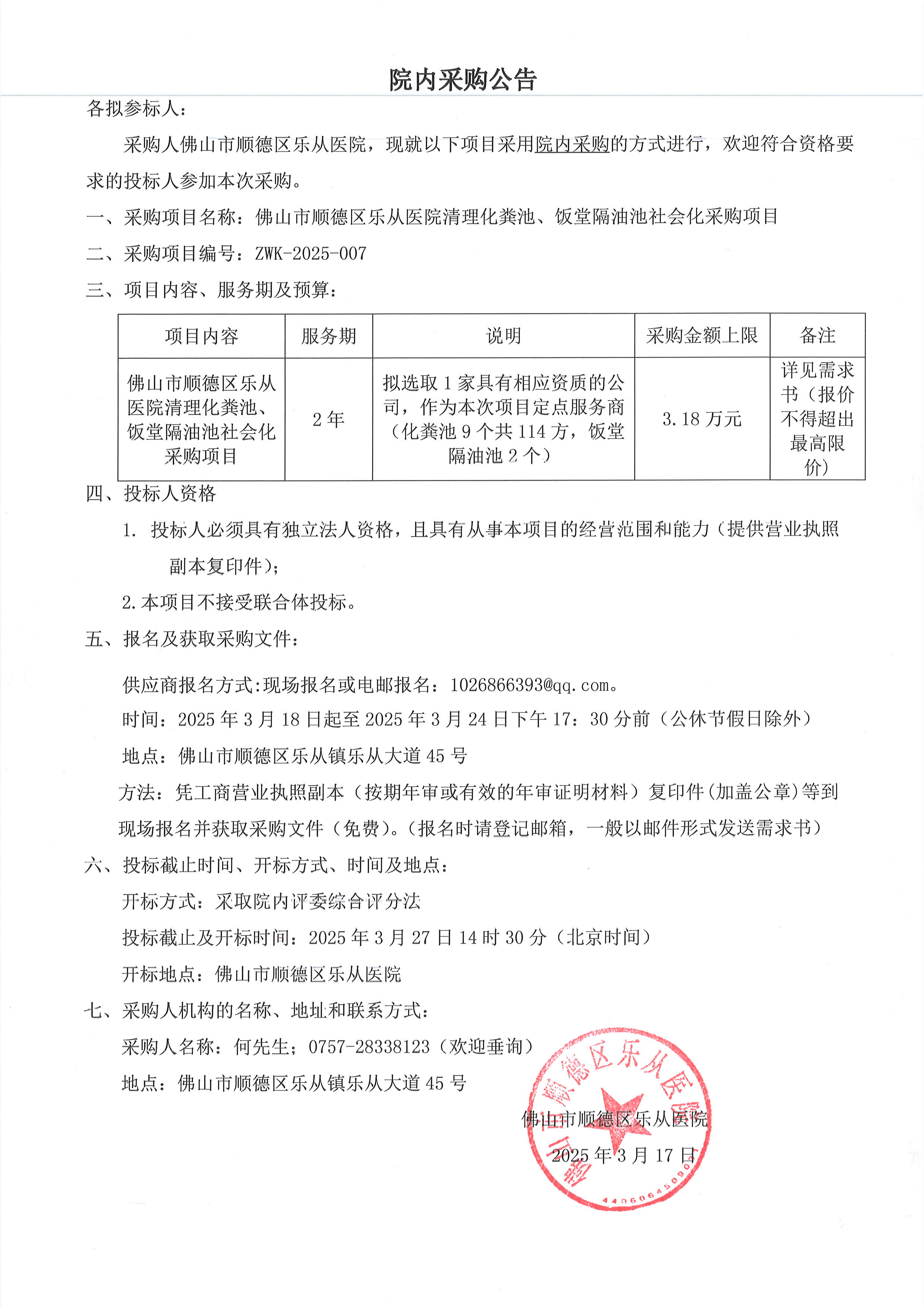 佛山市順德區(qū)樂從醫(yī)院清理化糞池、飯?zhí)酶粲统仨椖康脑簝?nèi)采購公告