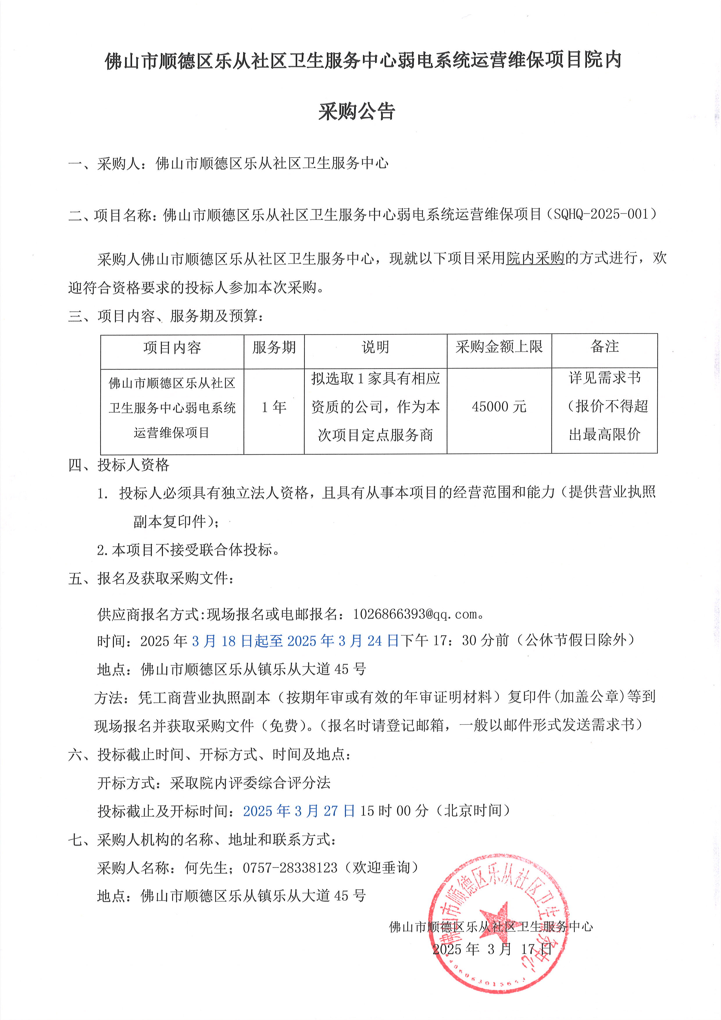 佛山市順德區(qū)樂(lè)從社區(qū)衛(wèi)生服務(wù)中心弱電系統(tǒng)運(yùn)營(yíng)維保項(xiàng)目的院內(nèi)采購(gòu)公告
