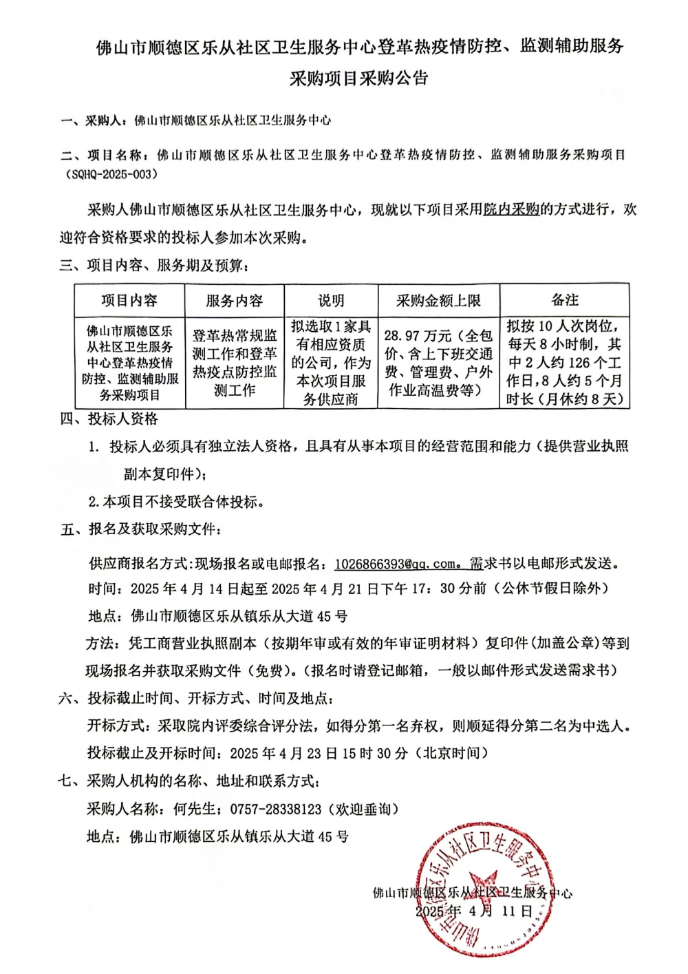 佛山市順德區(qū)樂從社區(qū)衛(wèi)生服務中心登革熱疫情防控、監(jiān)測輔助服務的院內(nèi)采購公告