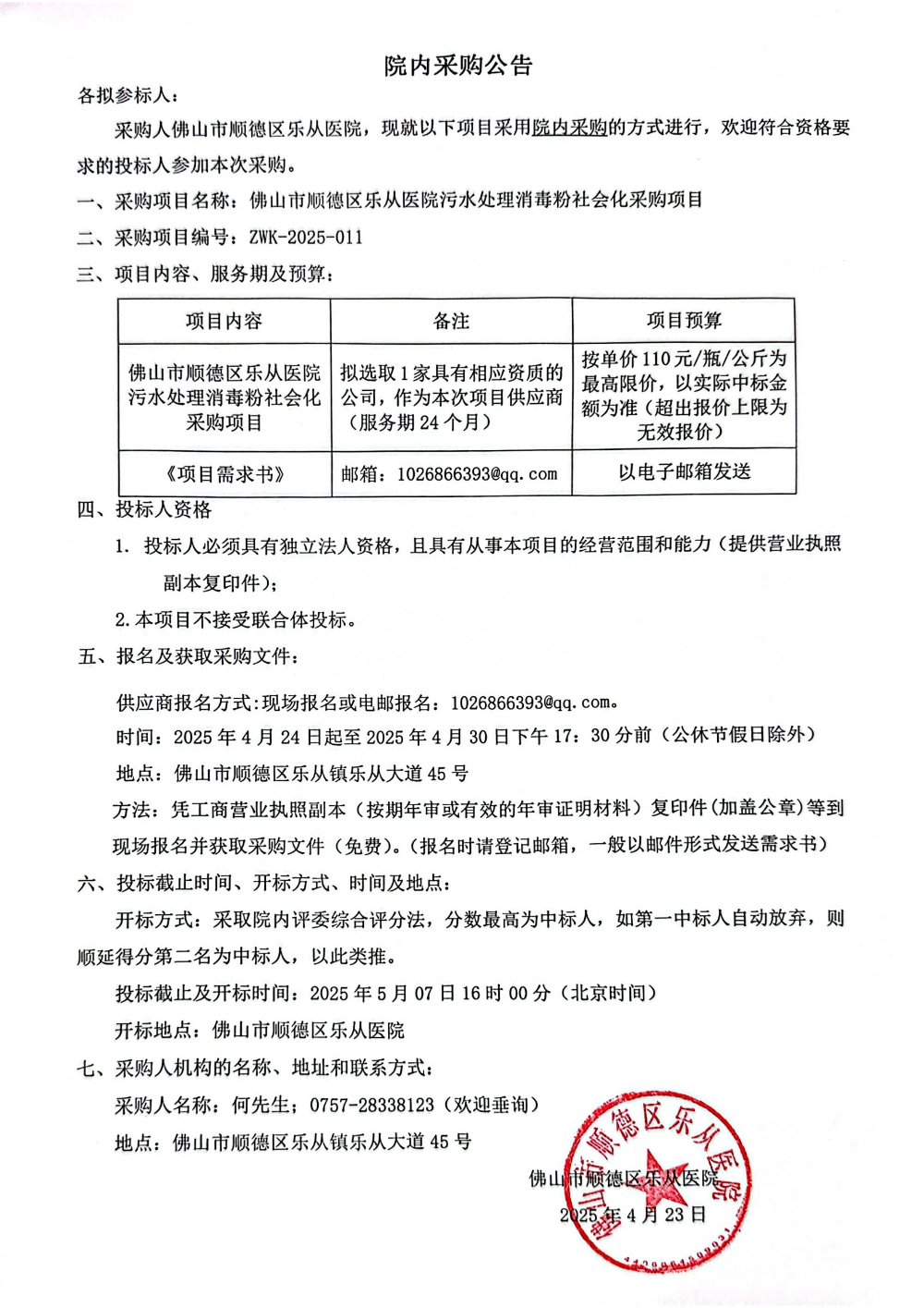 佛山市順德區(qū)樂從醫(yī)院污水處理消毒粉社會化采購項(xiàng)目的院內(nèi)采購公告