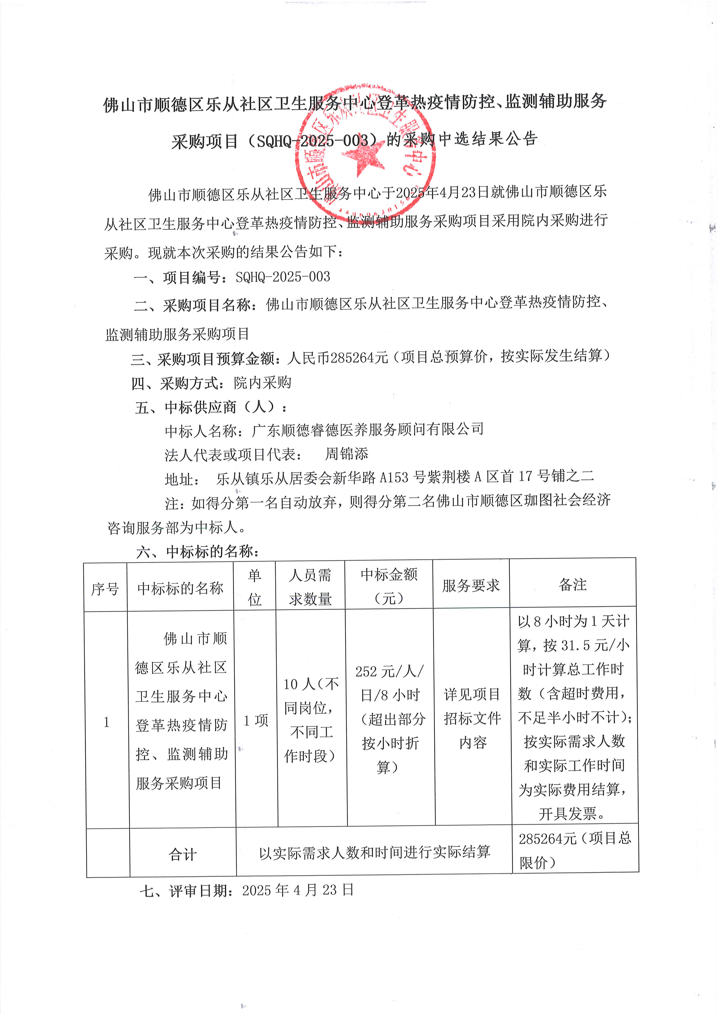 佛山市順德區(qū)樂從社區(qū)衛(wèi)生服務中心登革熱疫情防控、監(jiān)測輔助服務(SQHQ-2025-003)的采購中選結果公告