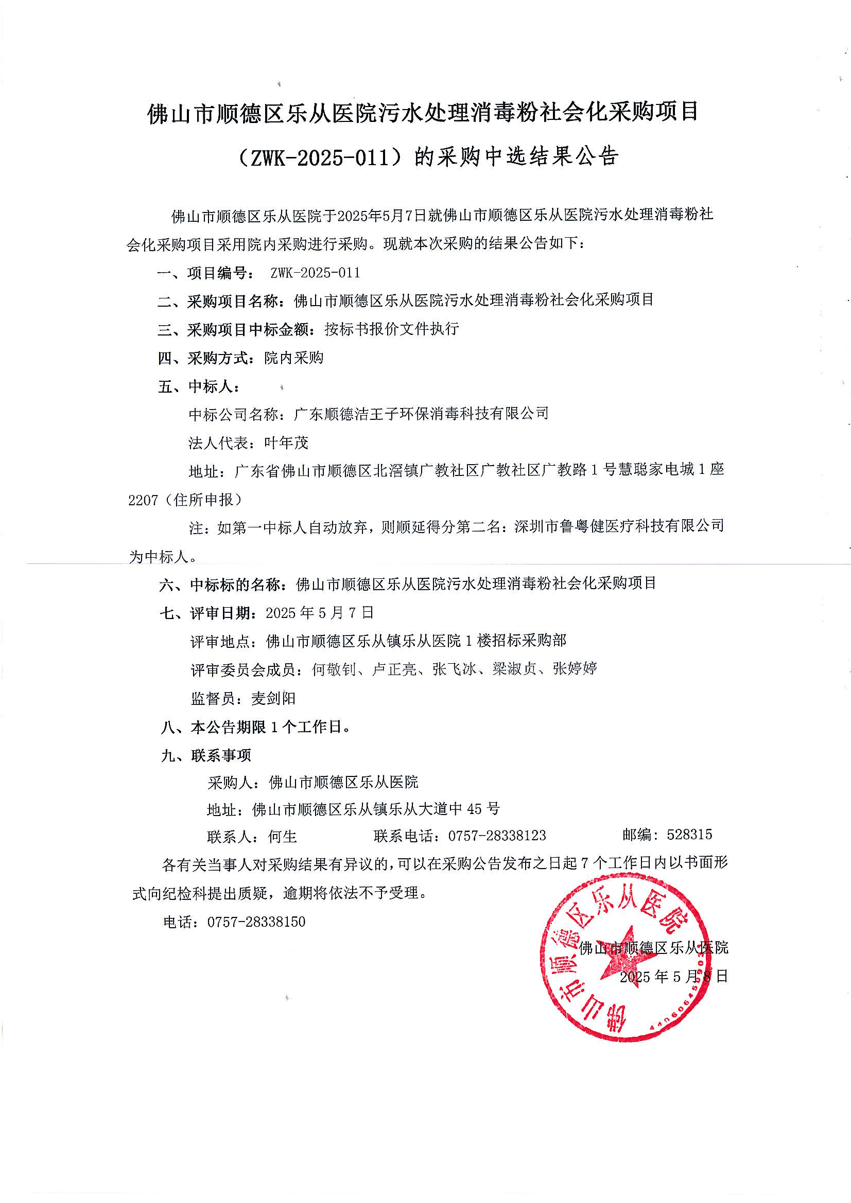 佛山市順德區(qū)樂從醫(yī)院污水處理消毒粉社會(huì)化采購(gòu)項(xiàng)目(ZWK-2025-011)的采購(gòu)中選結(jié)果公告