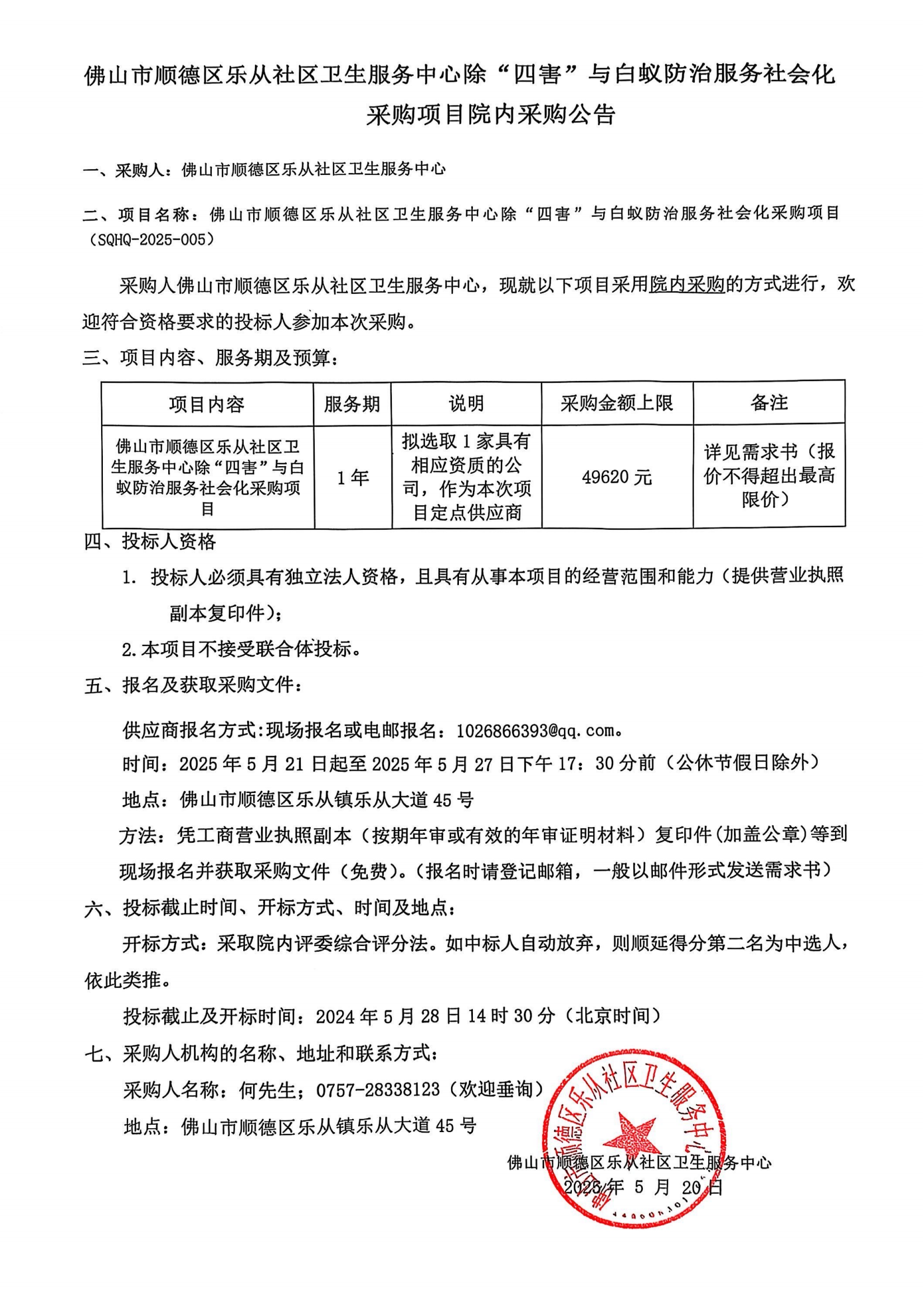 佛山市順德區(qū)樂(lè)從社區(qū)衛(wèi)生服務(wù)中心除“四害”與白蟻防治服務(wù)社會(huì)化采購(gòu)項(xiàng)目的院內(nèi)采購(gòu)公告