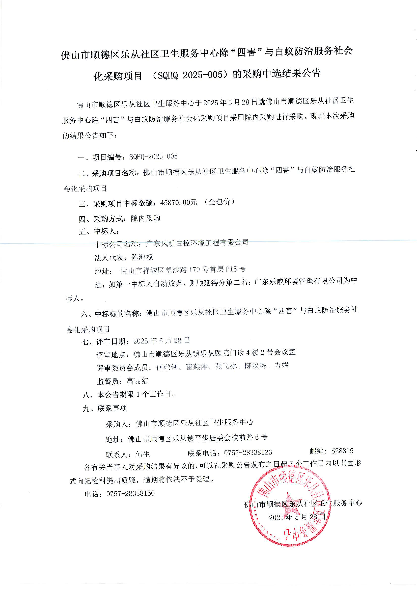 佛山市順德區(qū)樂從社區(qū)衛(wèi)生服務(wù)中心除“四害”與白蟻防治服務(wù)社會(huì)化采購(gòu)項(xiàng)目(SQHQ-2025-005)的采購(gòu)中選結(jié)果公告