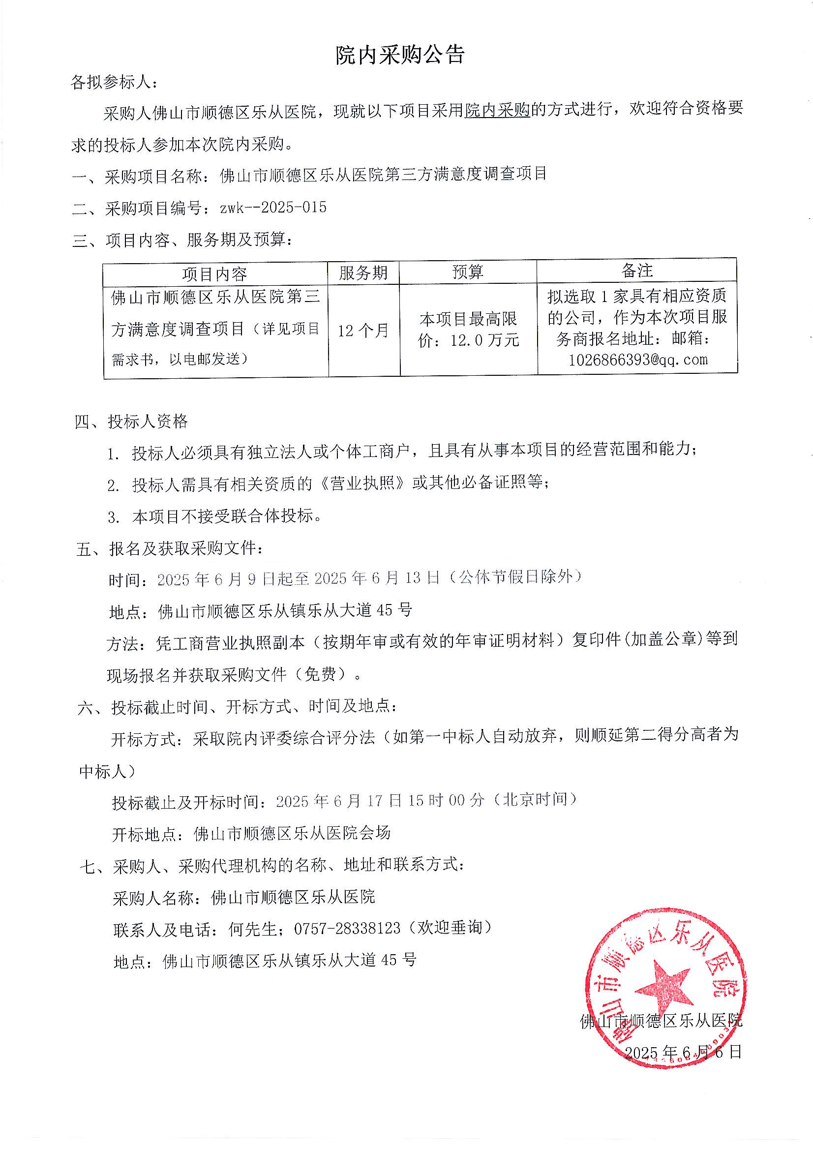 佛山市順德區(qū)樂從醫(yī)院第三方滿意度調(diào)查項目的院內(nèi)采購公告