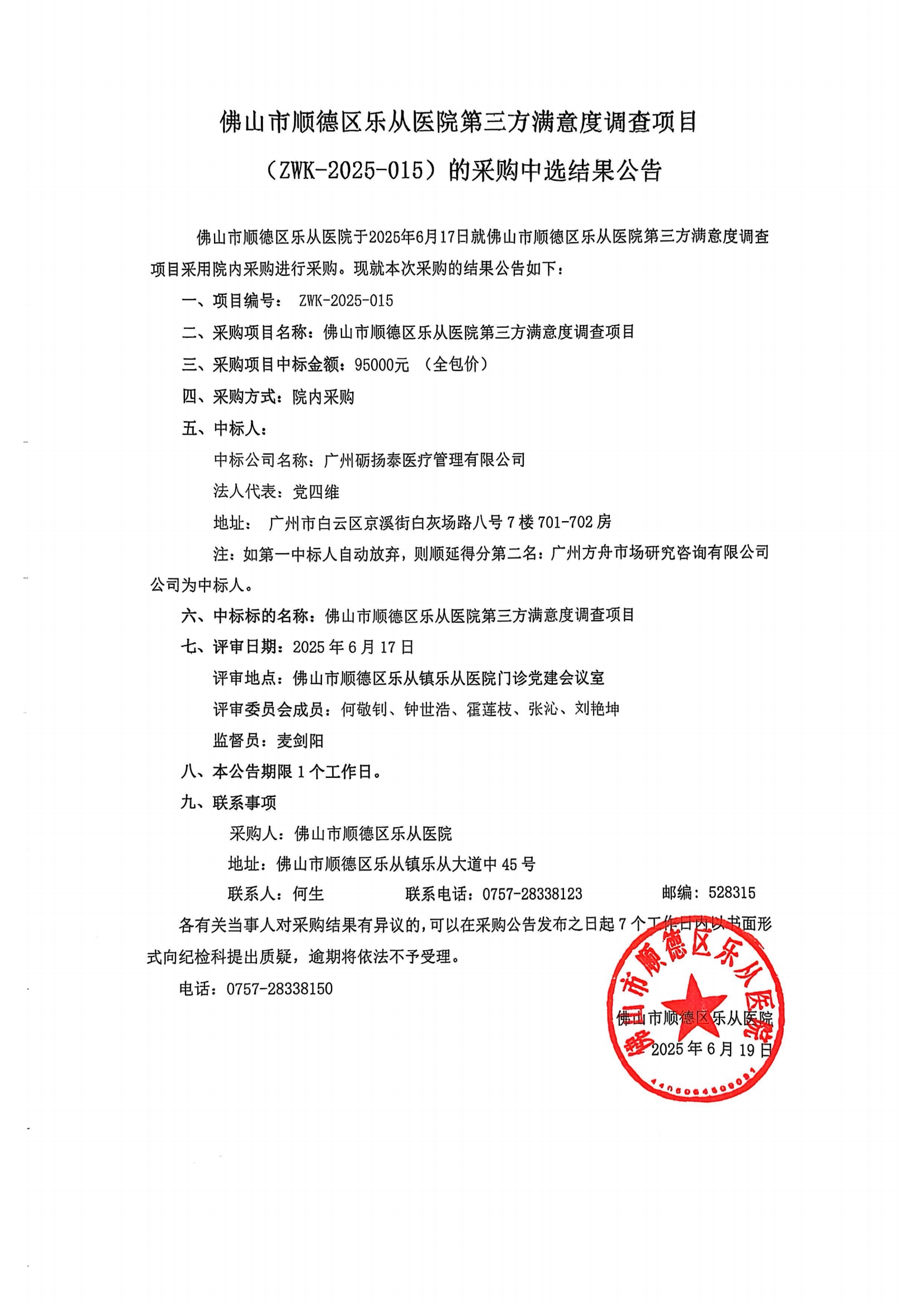 佛山市順德區(qū)樂從醫(yī)院第三方滿意度調(diào)查項(xiàng)目(ZWK-2025-015)的采購中選結(jié)果公告