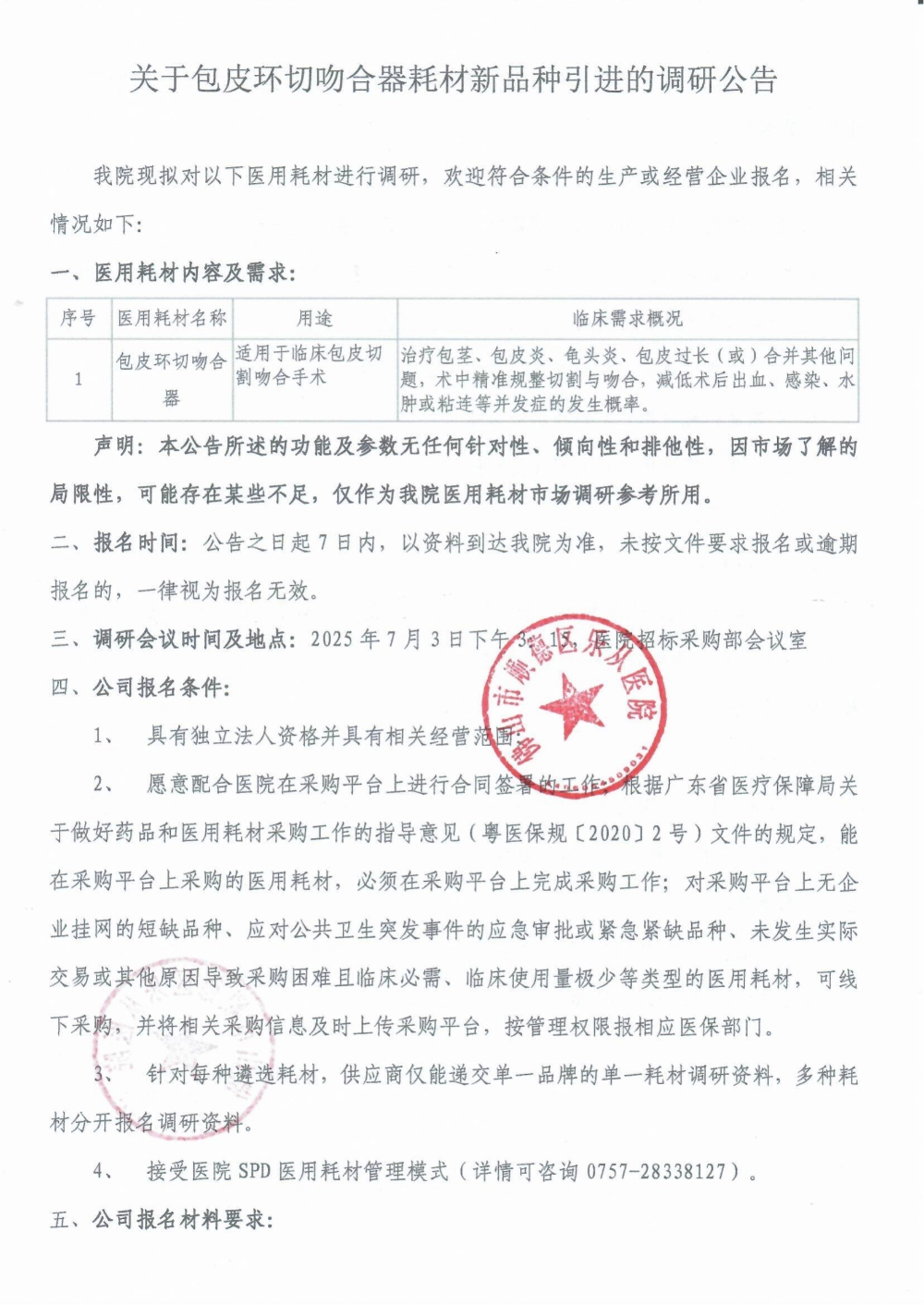 關(guān)于包皮環(huán)切吻合器耗材新品種引進(jìn)的調(diào)研公告