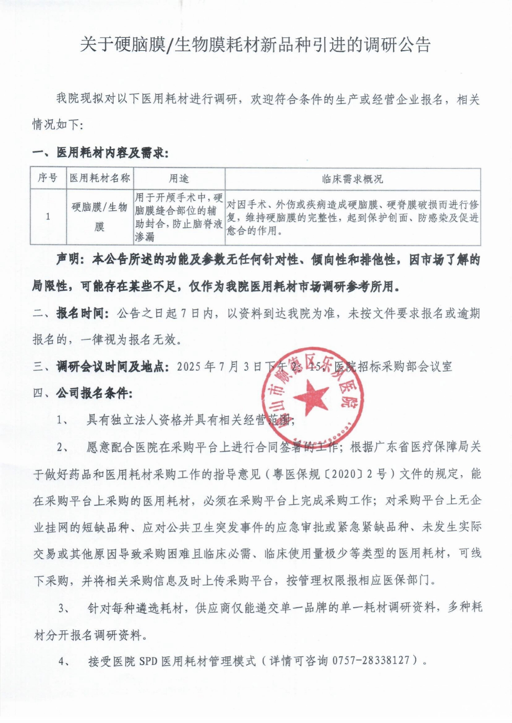 關(guān)于腦硬膜/生物膜耗材新品種引進(jìn)的調(diào)研公告