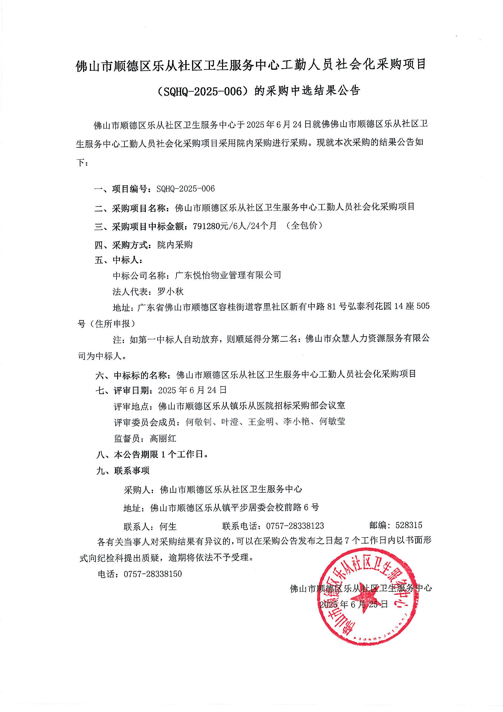 樂從社區(qū)衛(wèi)生服務(wù)中心工勤人員社會化采購項(xiàng)目(SQHQ-2025-006)的采購中選結(jié)果公告
