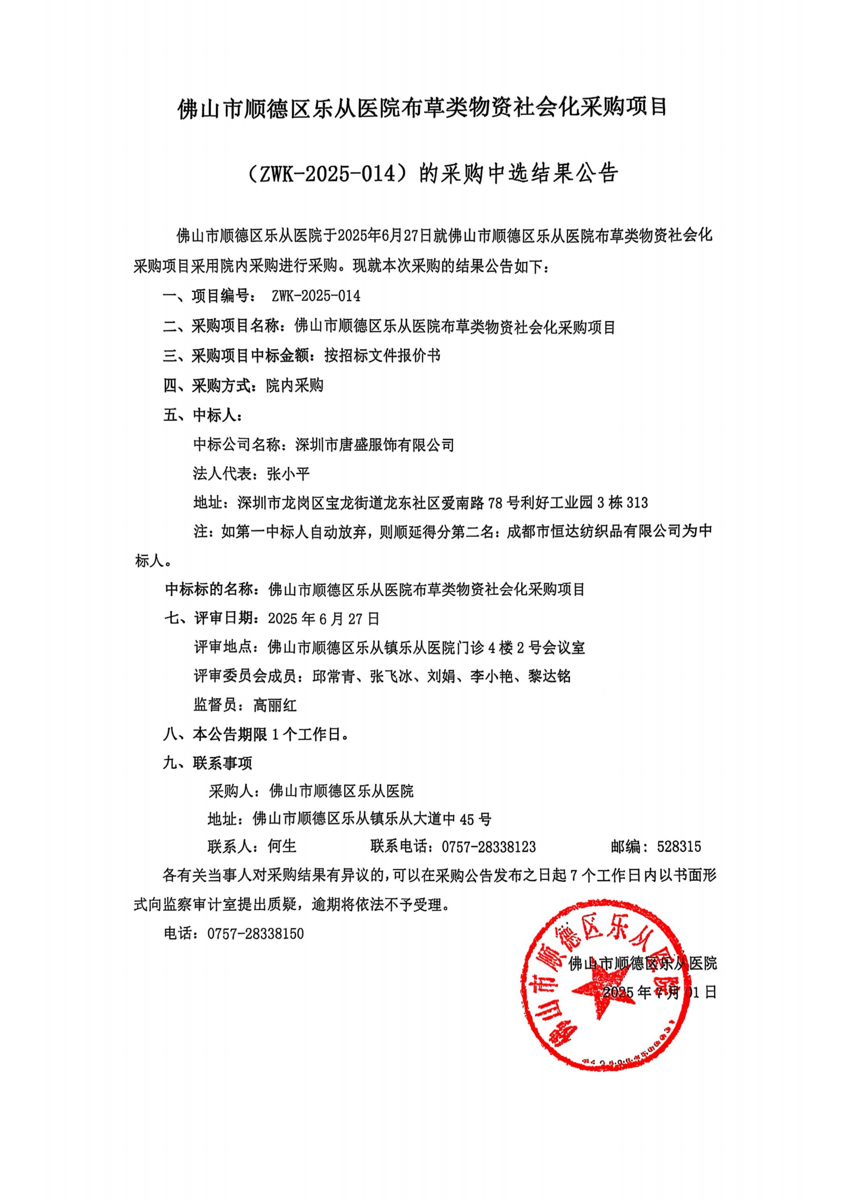 佛山市順德區(qū)樂從醫(yī)院布草類物資社會(huì)化采購項(xiàng)目(ZWK-2025-014)的采購中選結(jié)果公告