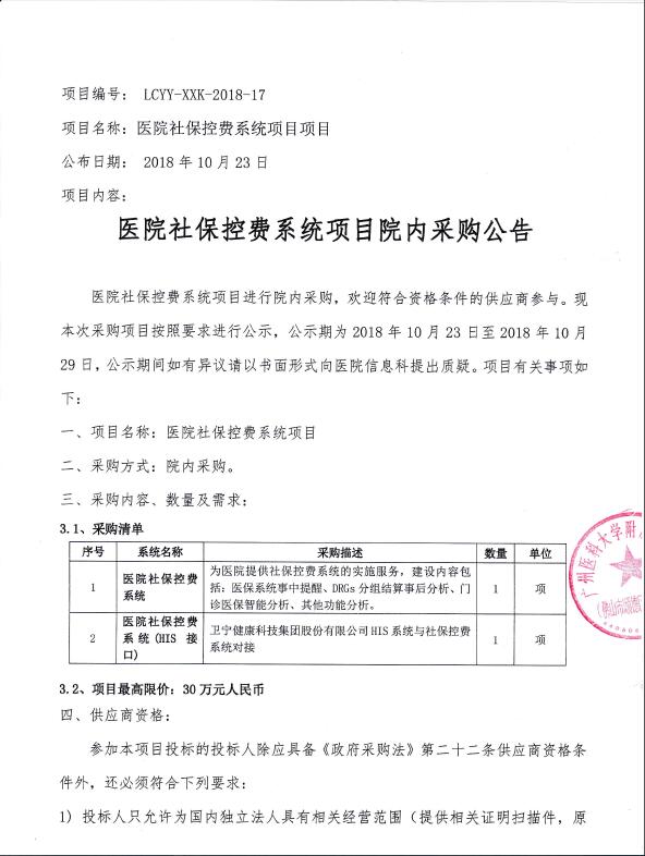 醫(yī)院醫(yī)保控費系統(tǒng)項目院內(nèi)采購公告